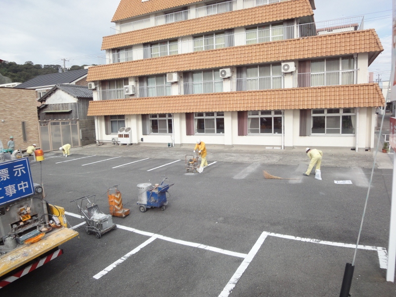 【工事前】駐車場のラインの位置を変えて、ラインを引き直します。今まであったラインを機械で削って消していきます(写真右)